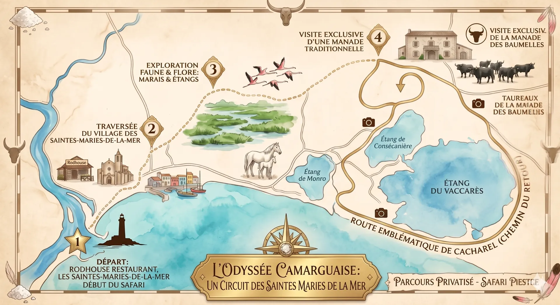 Bienvenue dans une terre de légendes, là où la nature dicte sa loi. Notre safari 4x4 privé vous propose une exploration sans concession du secteur le plus sauvage de la Camargue, au départ immédiat des Saintes-Maries-de-la-Mer. Ce parcours exclusif a été dessiné pour les voyageurs en quête d'authenticité, de confort et de dépaysement total.